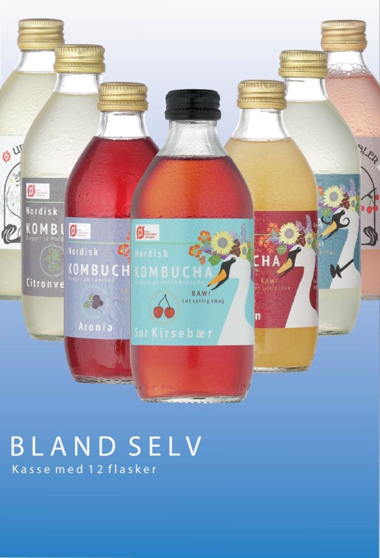 Bland din egen kasse! Vores håndbryggede kombucha er baseret på fermenterede nordiske urter, blomster og blade og har en let syrlig og frugtig smag. Hver flasker indeholder 33 cl af den forfriskende drik, der skal opbevares på køl. Går du meget op i sukkerindhold? Så er du det rigtige sted. Nordisk Kombucha indeholder 4% sukker.